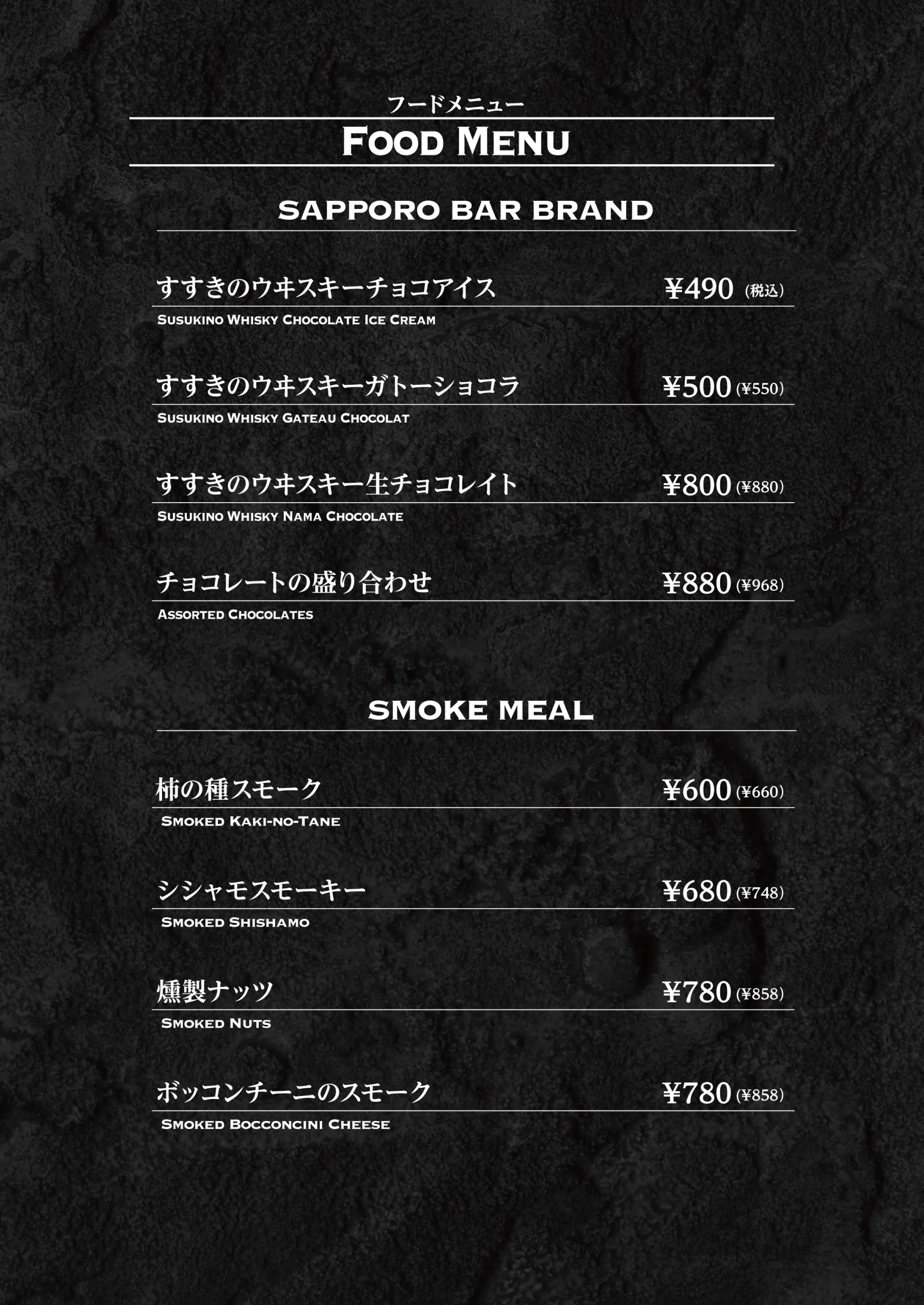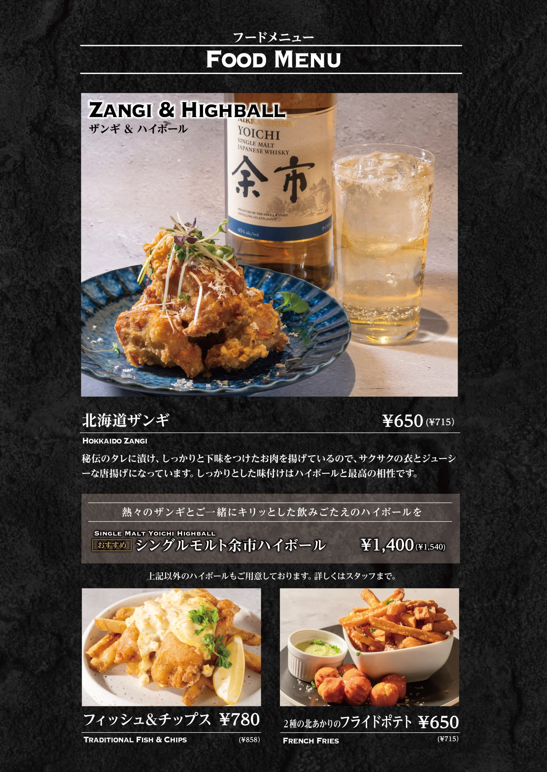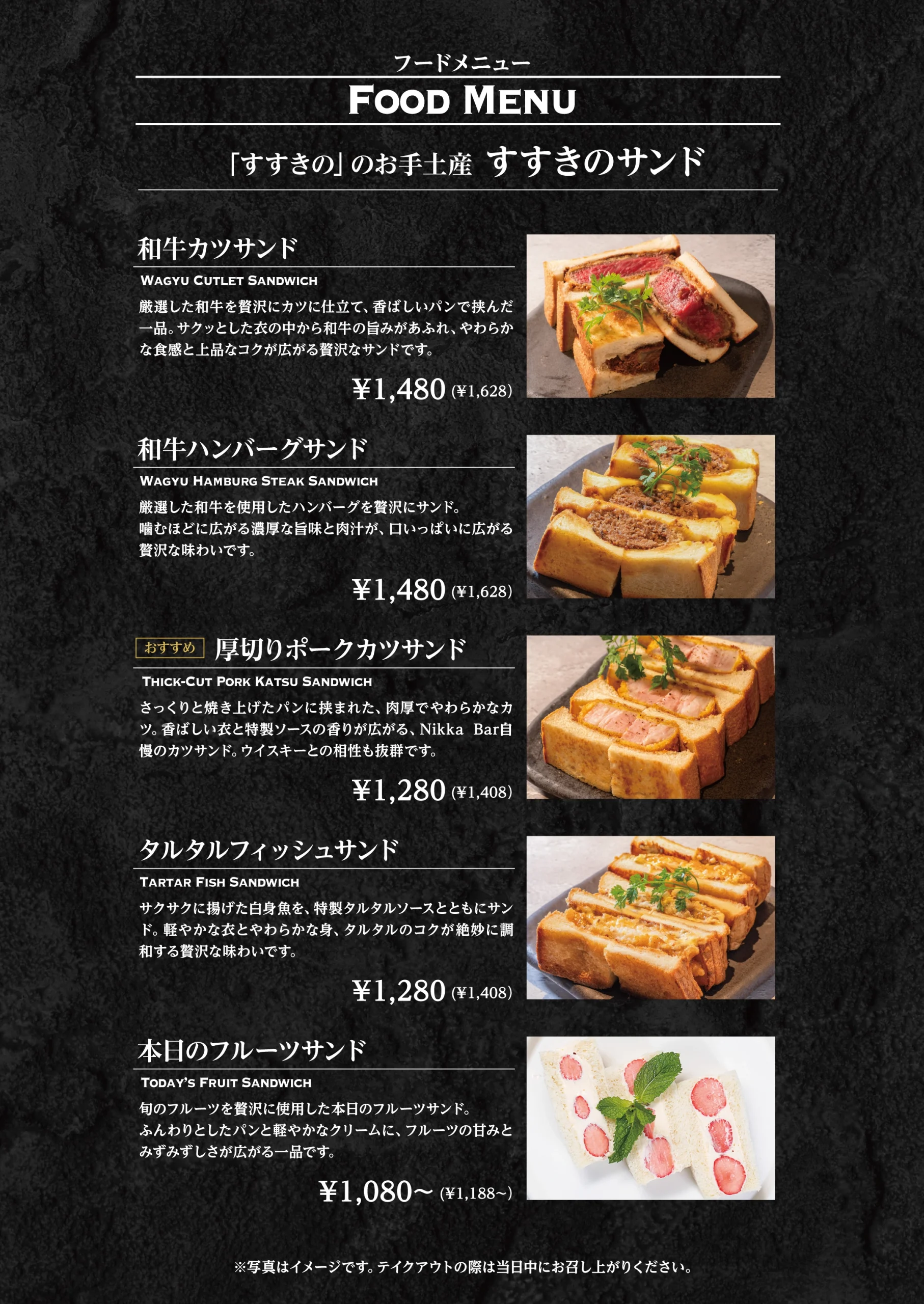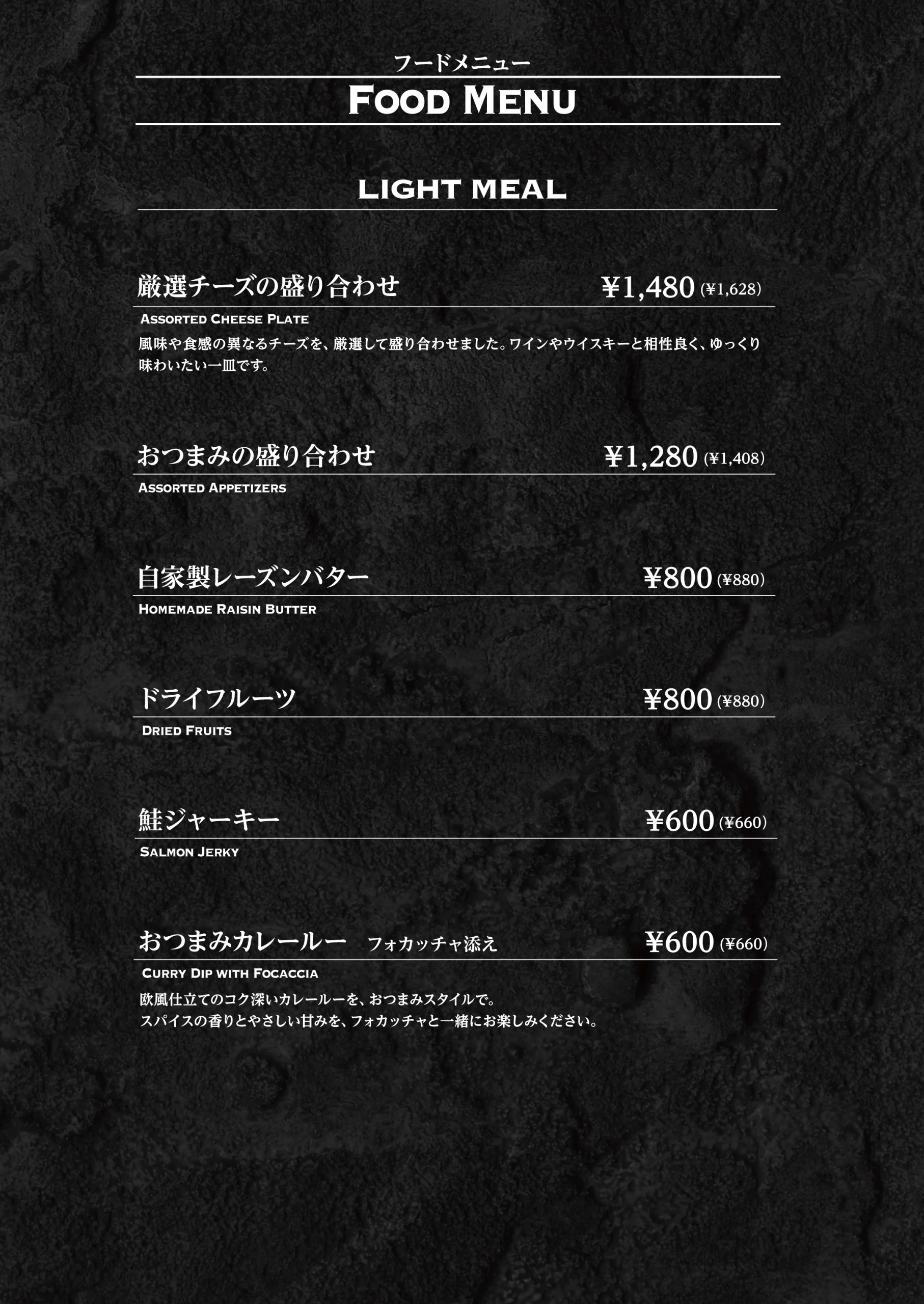Food Menu フードメニューは、 お酒とともに過ごす時間を引き立てる存在です。 特製カツサンドやザンギ、 軽くつまめるチーズやナッツ、 揚げ物まで、 バーで心地よく楽しめる内容を揃えています。 一杯に寄り添う一皿として、 また食事としても、 その日の過ごし方に合わせてお選びください。