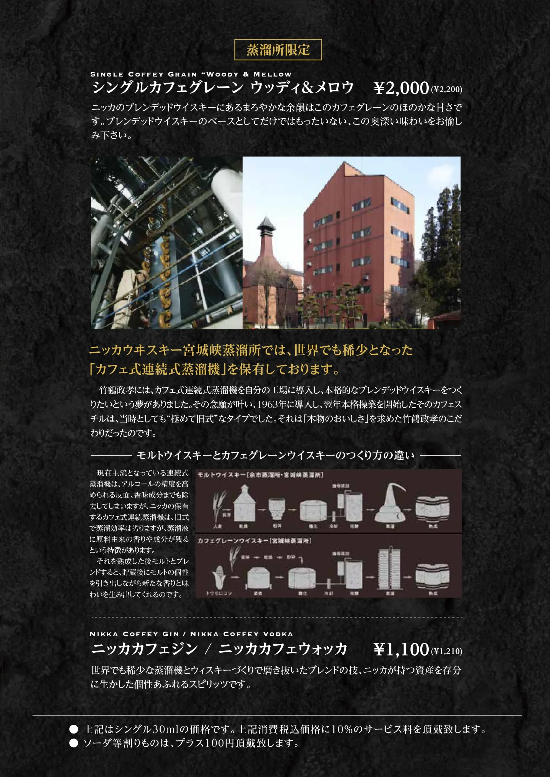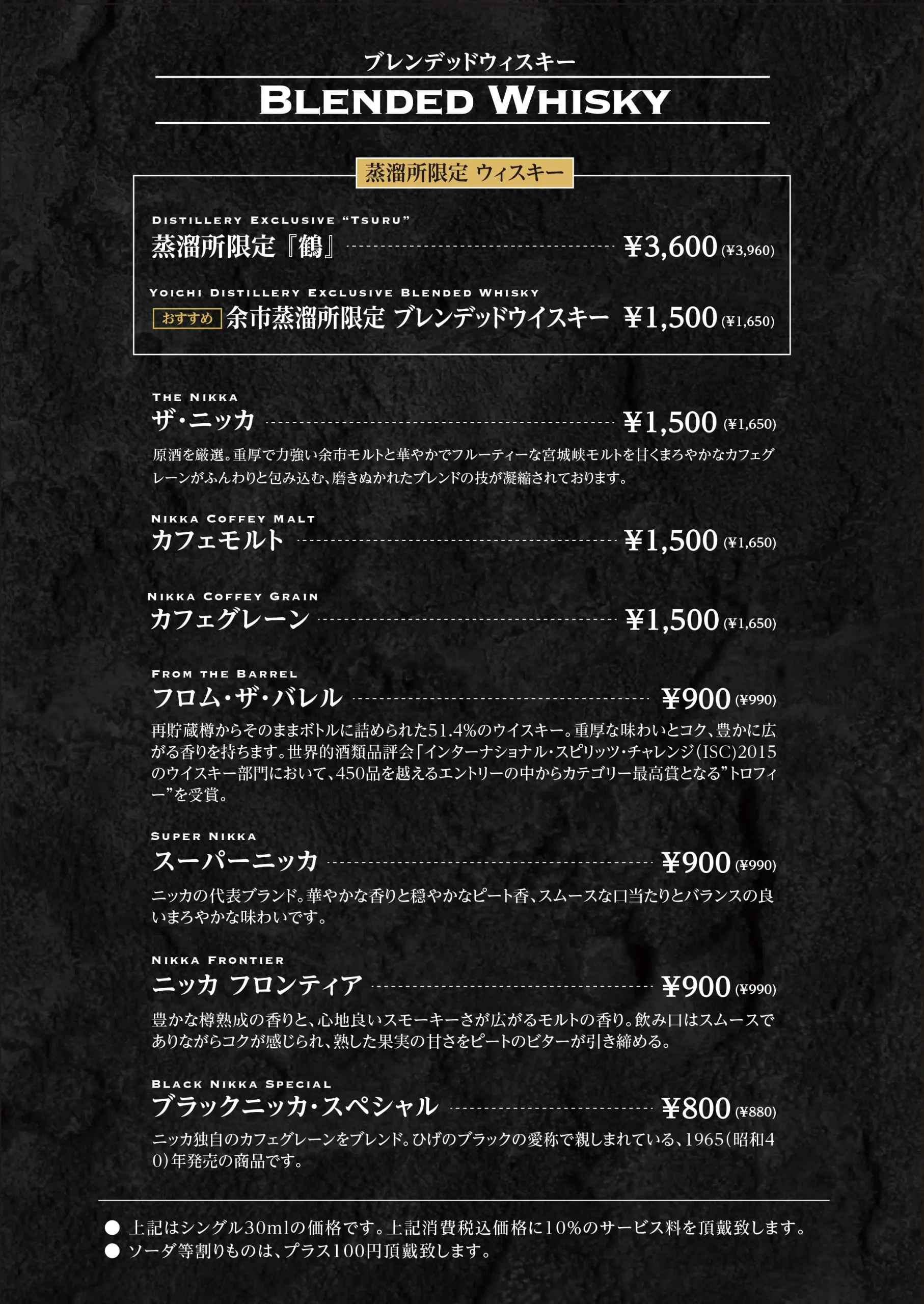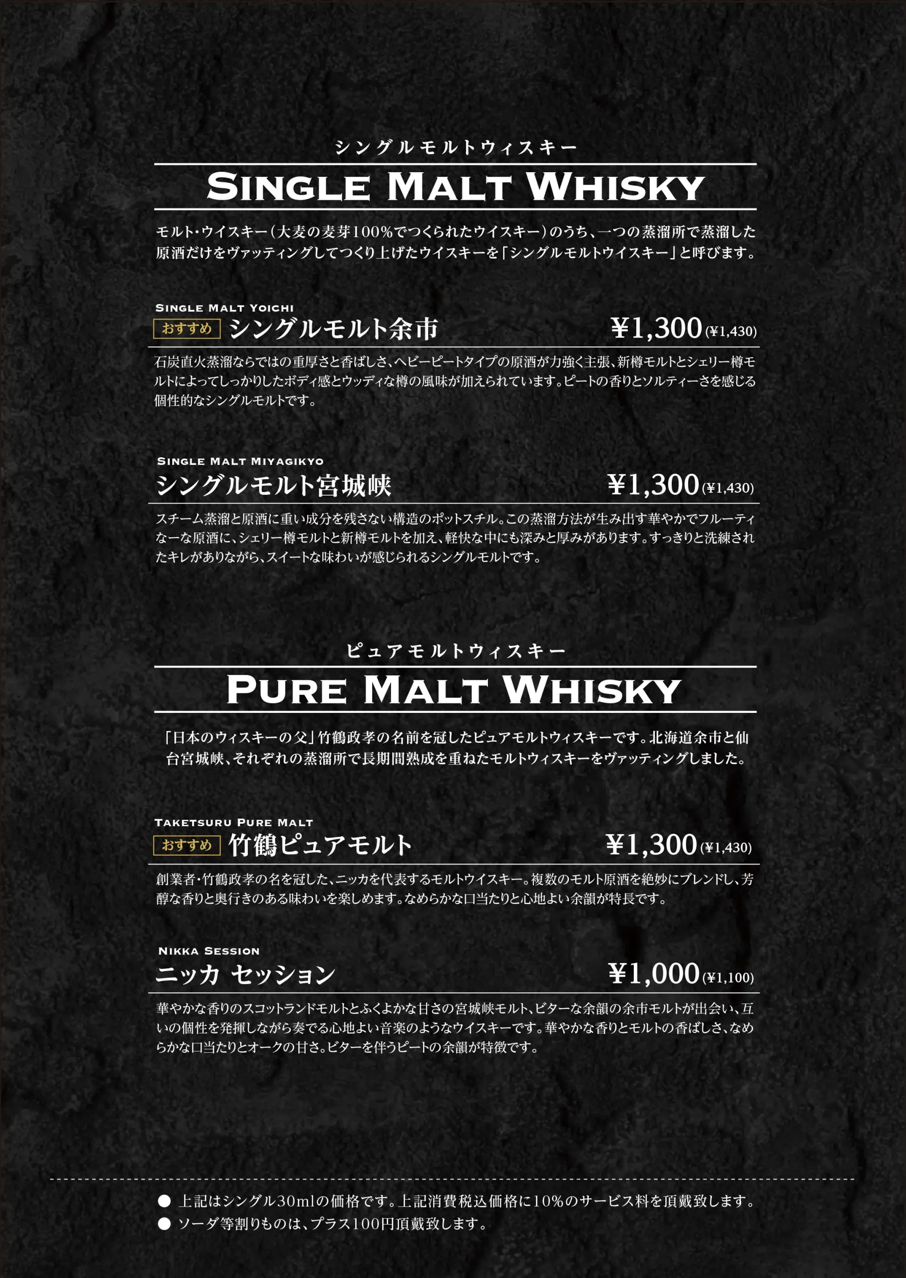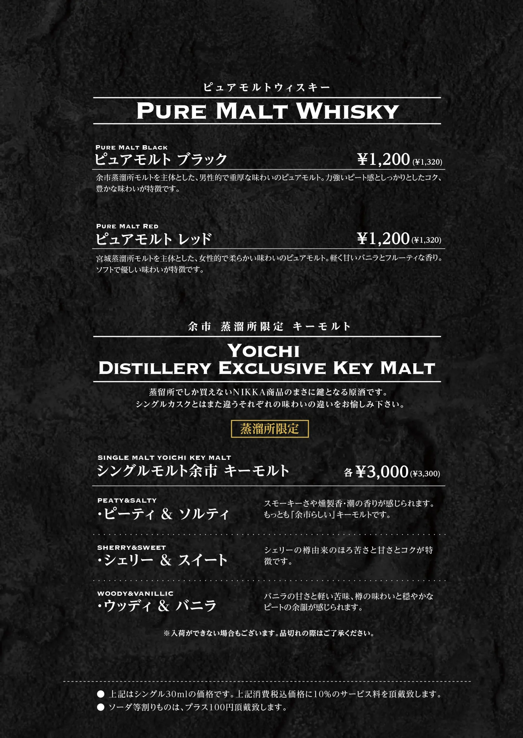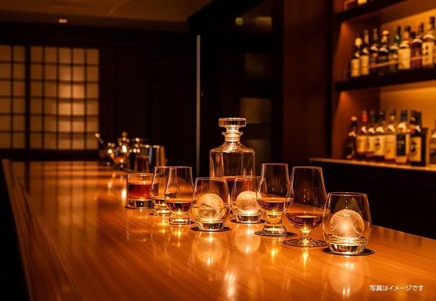 Whisky 余市では、 ニッカウヰスキーを中心に、 蒸溜所限定ボトルやキーモルト、 シングルモルト、ピュアモルト、 そしてブレンデッドウイスキーを取り揃えています。 石炭直火蒸溜ならではの力強さ、 樽由来の甘みやスモーキーな余韻。 それぞれの個性を、 音とともに静かに味わっていただけます。 ストレート、ロック、水割りなど、 お好みの飲み方でお楽しみください。