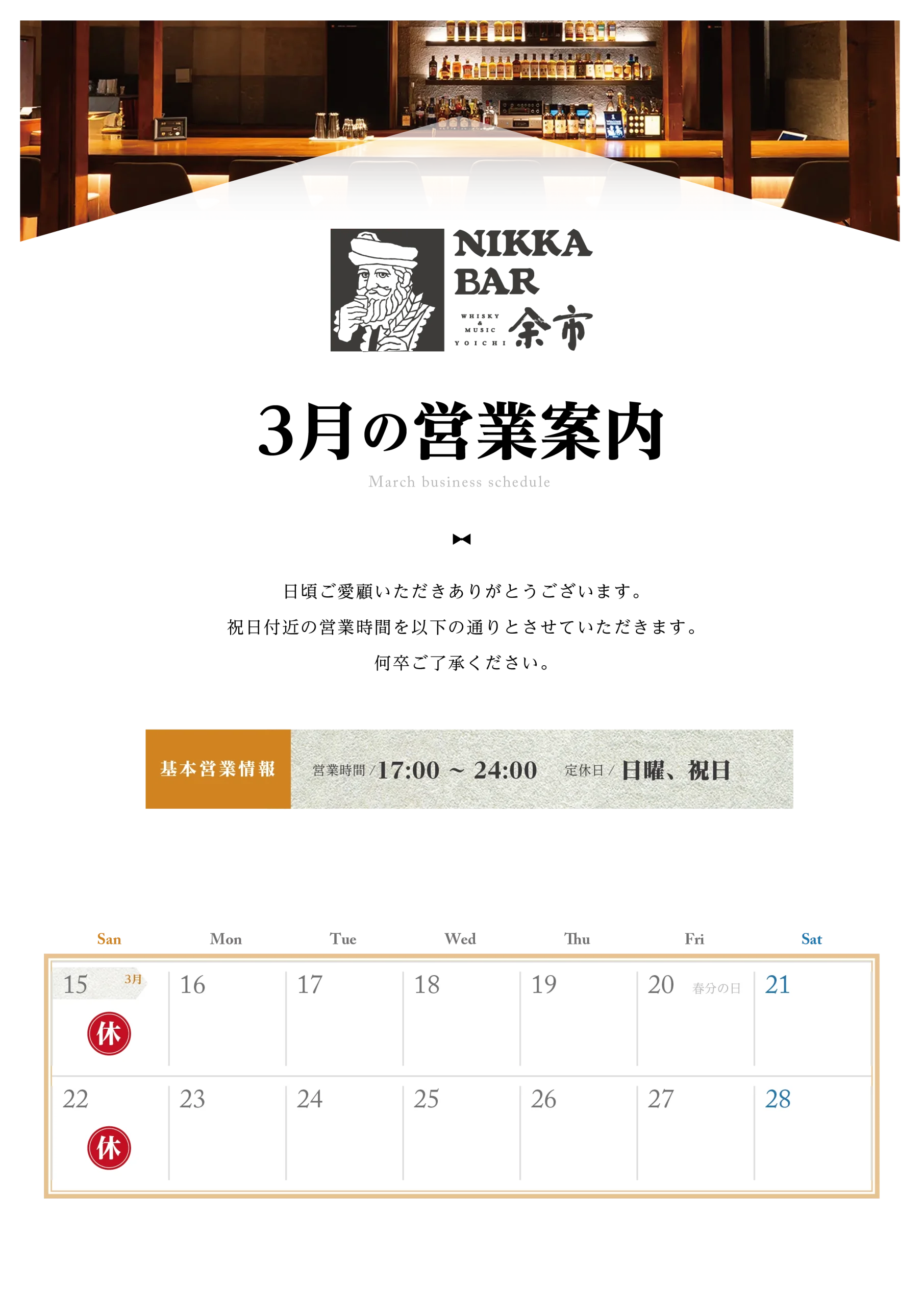 3月は祝日を含め、通常と異なる営業日・店休日がございます。