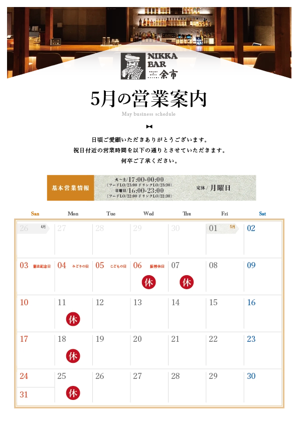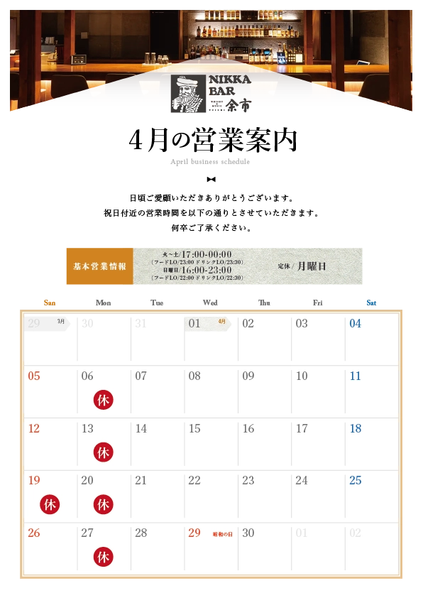 いつもニッカバー余市をご利用いただきありがとうございます。
